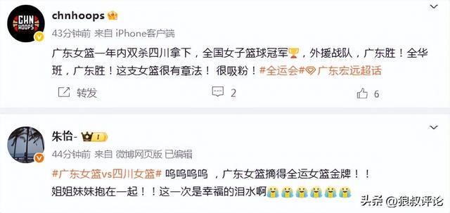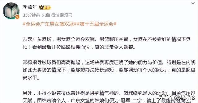 籃球記者季孟年發文點評:恭喜廣東籃球,男女籃全運會雙冠。男籃碾壓奪冠,女籃在不被看好的情況下登頂!看到最後幾位姑娘相擁而泣,真的非常令人動容。